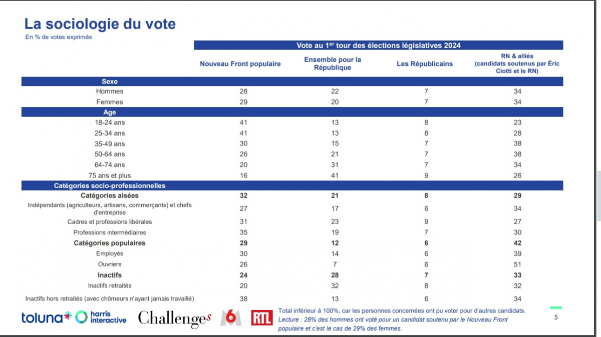 Aux dernières législatives ce qui a changé, c'est que le RN à progressé partout, et particulièrement chez les plus de 50 ans. Récupérer l'électorat de droite et centre droit, c'est la clé du succès pour le RN (tout le cirque sur la respectabilité, les cravates à l'Assemblée, plus de vannes racistes, de boneheads dans les meetings, un recentrage libéral moins virulent vis-à-vis de l'Europe, et le baratin sur la volonté de stabilité, c'est majoritairement pour ne plus faire peur aux vieux, et ça marche. C'est pour ça qu'ils ne peuvent pas voter trop de censures).