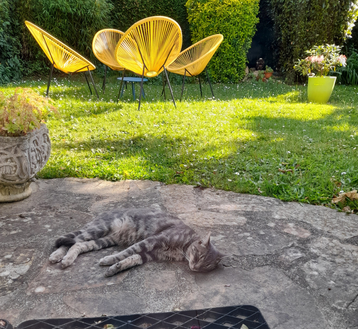 Elle a bien pigé mes horaires, elle est devant la fenêtre à 6h pétante pour rentrer ( heure du lever pour aller bosser) de sa maraude, s'installe sur mon lit pour pioncer toute la matinée. (Elle ne vient jamais sur mon lit quand j'y suis, je dois respirer trop fort, ou pire, j'ose même parfois bouger)