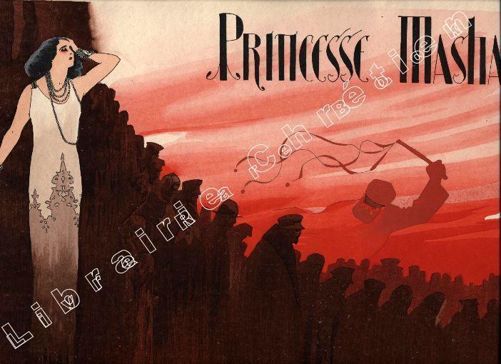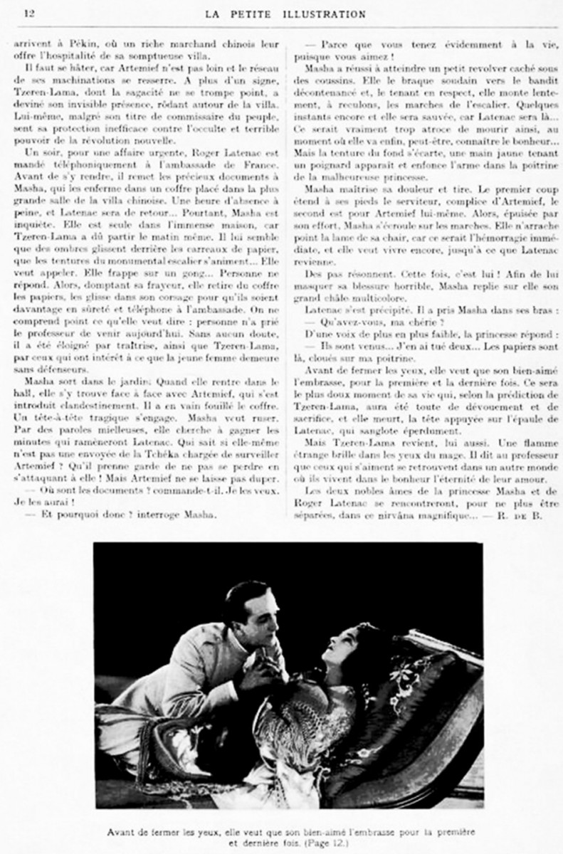 Pour le film de René LEPRINCE qui retrace les aventures de Masha, petite fille recueillie et élevée par un groupe d'hommes révolutionnaires avant de devenir une jeune fille d'une radieuse beauté, et son expérience de la guerre et de la révolution. C'est Claudia Vitrix qui interprétera le rôle titre. Elle prête ses traits à l'héroïne que l'on retrouve sur cette première page : dans un geste théâtral, elle porte la main à son front. L'image est saisissante par le contraste entre sa figure blanche au premier plan, et l'arrière plan qui forme une vague rouge dans laquelle on distingue au-dessus du peuple qui avance la tête basse, un soldat brandissant un fouet.