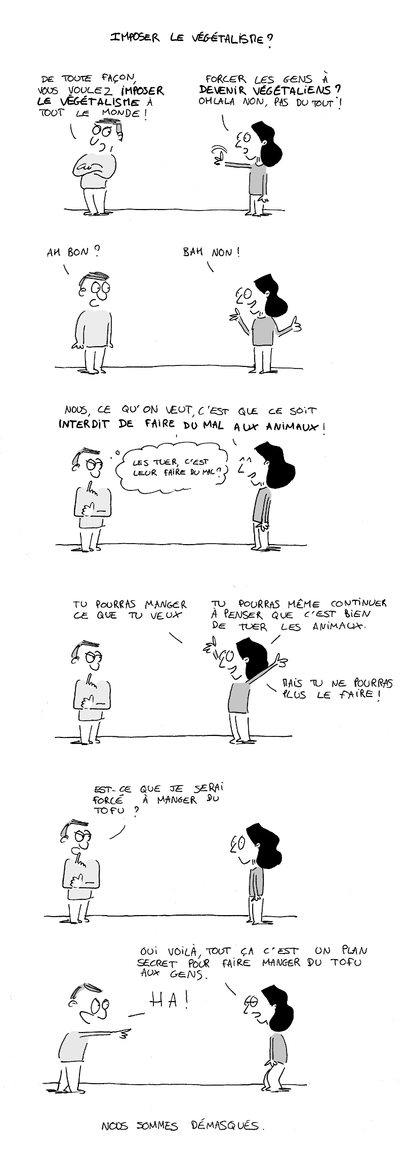 Ici, il est simplement question de reconnaître que se nourrir de chair animale est mauvais sans doute pour le corps, mais sans aucun doute pour l'esprit - puisque c'est mauvais pour les animaux. Libre à toi de ne pas en être d'accord : personne ne te met le couteau sur la gorge.