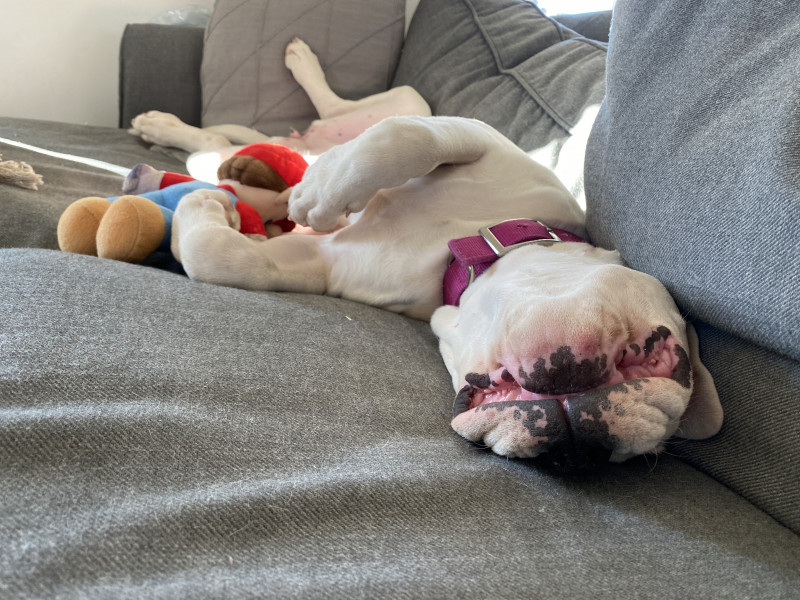 Bon le mien ne dort pas toujours comme ça, mais parfois il reste dans cette position les 4 fers en l'air pendant un moment, entre ça et les aboiements dans son sommeil c'est dur de ne pas éclater de rire!