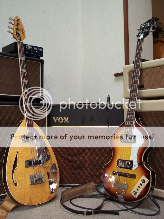 Essai cet après-midi dans mon Vox AC15 de '63 (qui est un modèle étiquetté "bass" - en fait totalement identique à un autre AC15 guitare d'époque, sauf le switch "brillance" qui déclenche une égalisation basse); par respect pour l'ancêtre, je le branche dans le baffle de l'AC30CCX (2 alnico blue au lieu d'un) et j'évite de trop pousser le volume. Pas de surprise, ça sonnait déjà Beatles dans mon Laney transistor, donc ici évidemment ... le pied