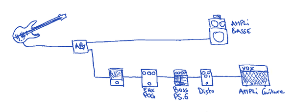 Je me suis d'ailleurs posé la question de savoir si, à l'instar d'une Rick, il n'avait pas 2 sorties sur ses basses mais pas chevalet/manche et plutôt MI, LA/ RE, SOL jusqu'à ce que je comprenne que les pitchs étaient fait avec un pitch shifter, donc à la pédale. La question venait des passages guitare sans basse.