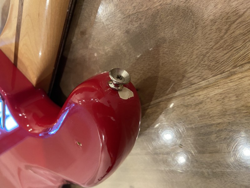 Pour finir, le "poc" est sacrément vilain. Mais il y a probablement moyen de le rattraper avec de la pâte à bois (si besoin), ponçage, et raccord peinture.