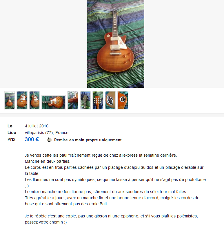 Si n'avoir rien fait c'est : ne pas jeter de l'argent par les fenêtres, ne pas acheter de la cagette hors de prix (oui parce que c'est hors de prix, pour 230 balles t'as quand même de quoi avoir vachement mieu), sous prétexte que ça ressemble de loin et en louchant à une Gibson. Et surtout de ne pas essayer au passage de se faire sa marge comme un vilain receleur.