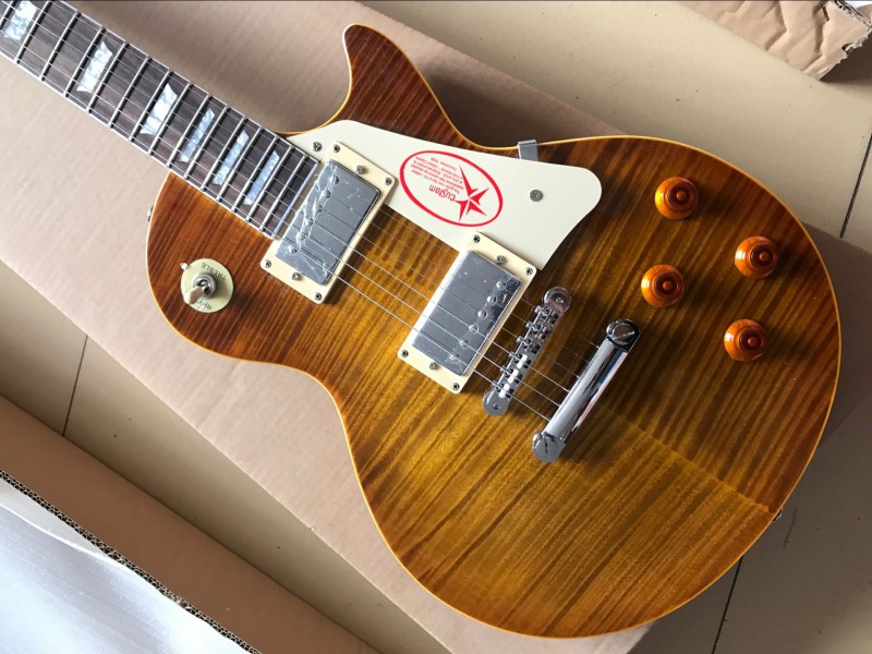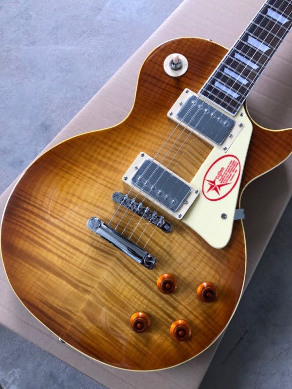 Chevalet tone pro, lemon burst, zebra pu, binding blanc et sur les frettes le tout avec une flamme symétrique et homogène.
