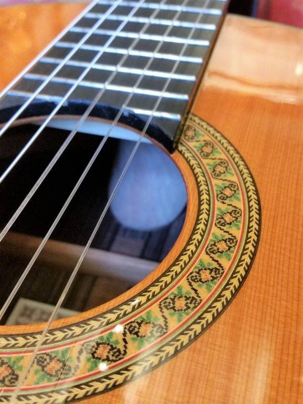 La guitare classique que j'ai achetée et que j'ai toujours ? J'ai essayé la moins chère du magasin et j'ai monté en prix jusqu'à l'effet "Wahou !" je me souviens que je jouais entre autre le Mi et Fa flamenco : sur l'accord de Fa on joue les 2 cordes aiguës à vide, accord "ouvert" typique d'une fin de gamme andalouse (Lam - Sol - Fa - Mi7) avec les dissonances typiques flamenco : des notes du Mi dans le La et des notes du La dans le Mi.