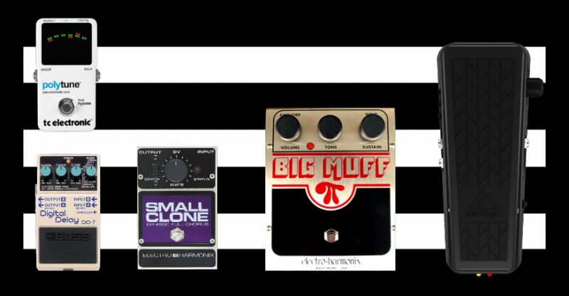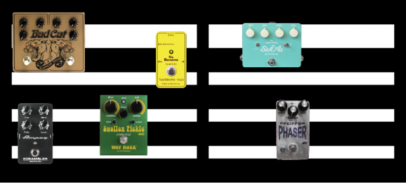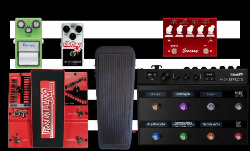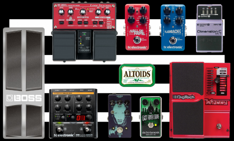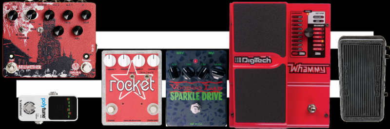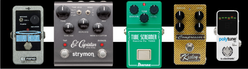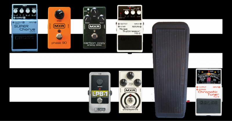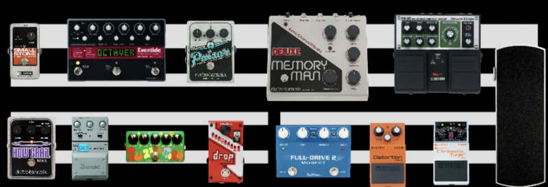 Metro24 parce que je ne souhaite pas beaucoup de pédales. D'abord parce que plus il y en a, plus c'est une source de buzz, de hum, de… bruits indésirables et puis c'est rapidement le souk. Le Metro24 est de forme allongée pour avoir qu'une seule rangée de pédales en épi afin de dégager de la place pour les câbles et laisser chacune accessible au pied dans une disposition aisément reconnaissable.