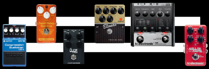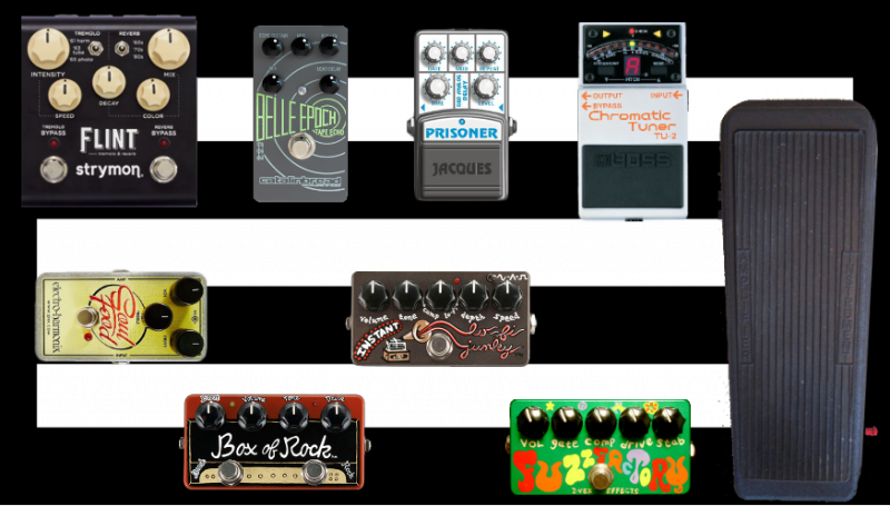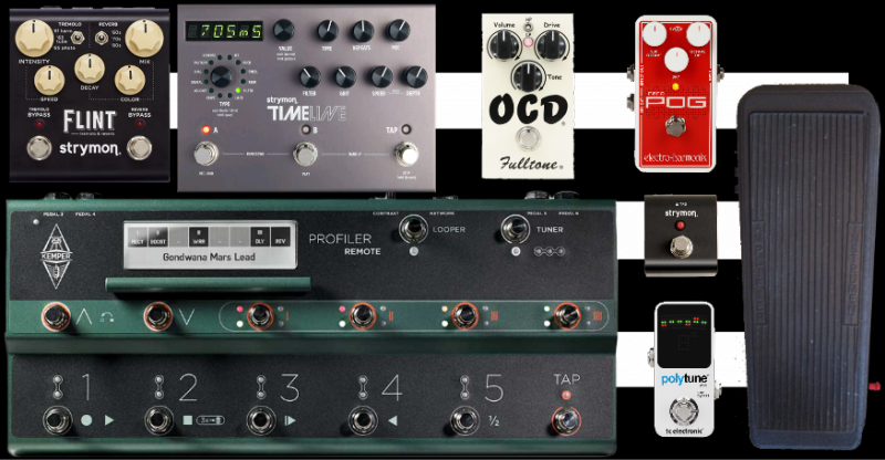 Un comp, 2 OD, une sensible à l'attaque et l'autre Dumble-like (je n'ai hélas pas la Dude mais une Mooer) avec un grain serré et un voicing des medium spécifique. La Blonde (j'ai un clone Joyo) me permet d'obtenir le genre de son Fender clean-crunch pour pas cher (Blackface) avec une sortie HP émulée, les deux dernières sont en stéréo car c'est un rig pour enregistrer et la stéréo, c'est fumant.