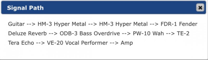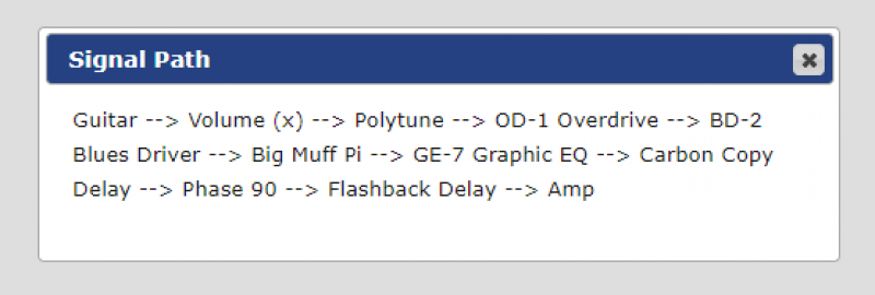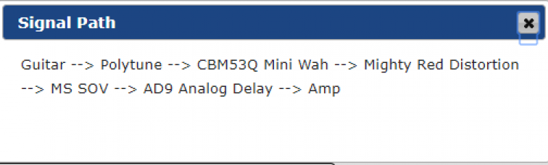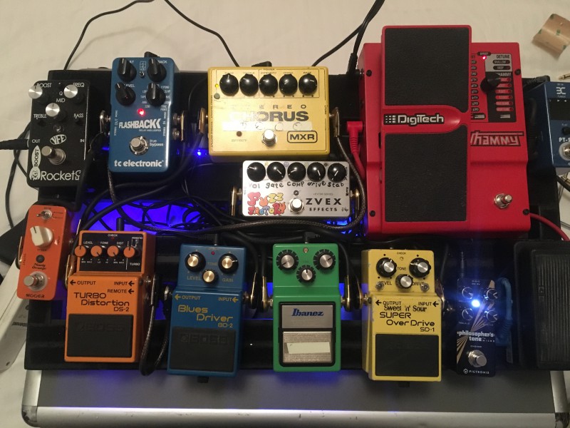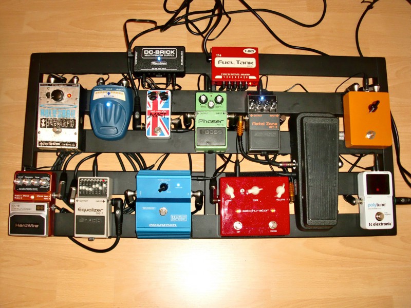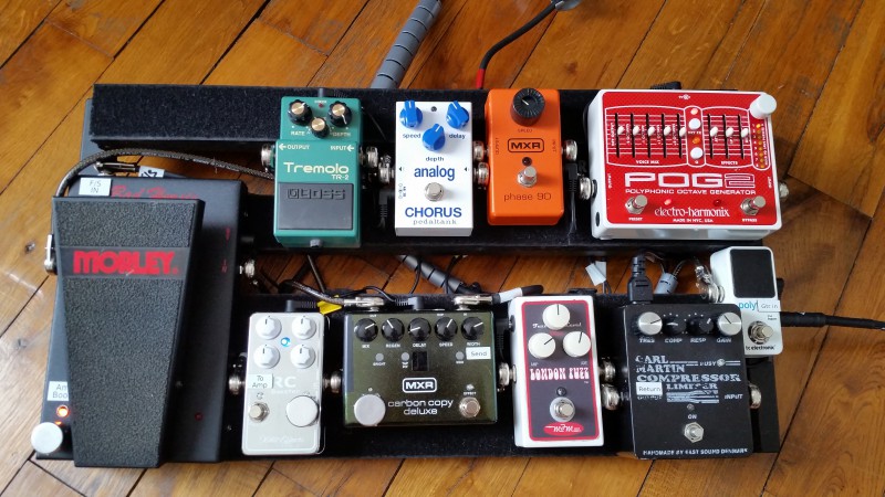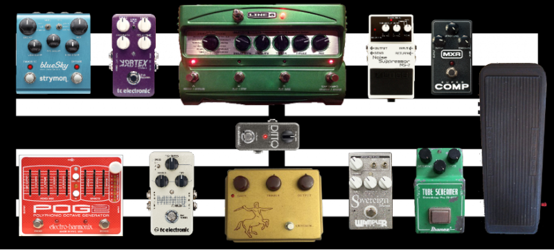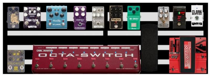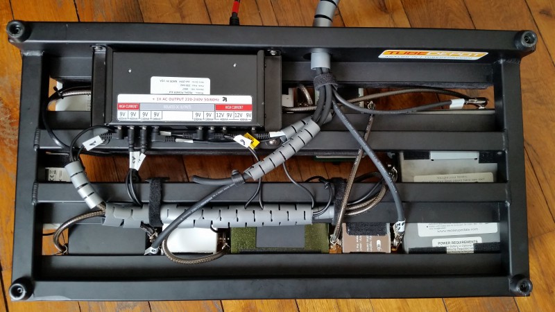 Tout rentre en façade du Switcher sauf la Wah, Wahmmy, Buffer, Compresseur et accordeur, les deux Delay sur le même Canal et les effet de modulation passe par la boucle d'un H&K Tubemeister18. Un montage sympa mais un peu bordélique sur le Gator...