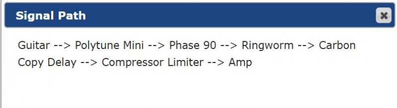 Le canal 1 est un Clean Reverb (Meteore), le 2 est un Mid-Gain (LunaStone), le 3 un High-Gain (Sovereign+Precision Drive), le 4 un Mid-Gain Solo (LunaStone, Caroline, Plainsman), le 5 un High-Gain Solo (Sovereign+Precision Drive+Meteore+Plainsman), le 6 un Clean Cosmos (Meteore+Faux Tape Echo ou Kylobite, c'est selon), le 7 un Mid-Gain Cosmos (LunaStone +
