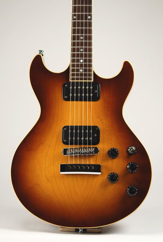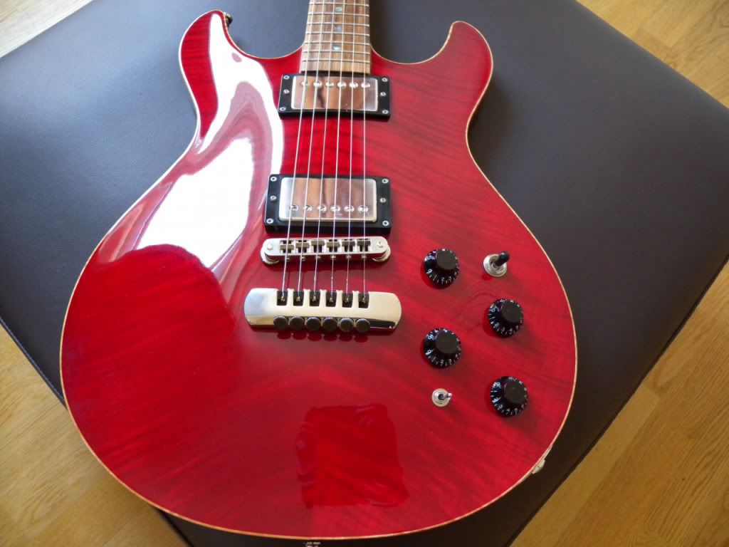 The Esprit’s body is slightly larger than the Flame’s, and features two symmetrical cutaways. As with the Flame, two special-design Schaller humbuckers were employed in conjunction with the fine-tuning tailpiece. This instrument was intended as an alternative to the Gibson ES-335.