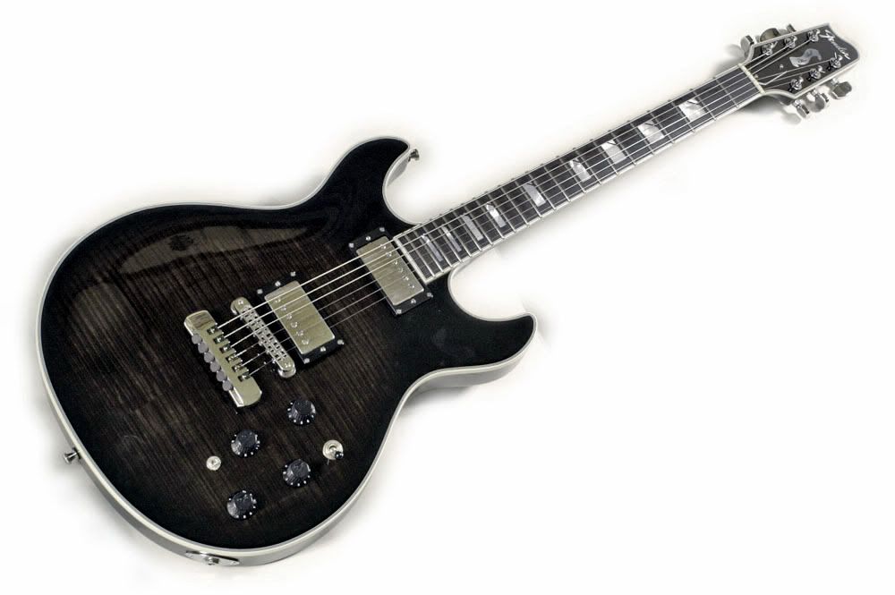 mahogany bodies and set in necks. The Elite features a hand-carved figured maple top and fingerboard
