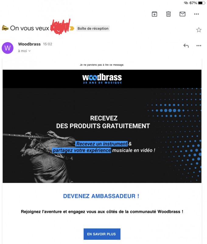 Qui a reçu ce mail de woodbrass? On le vire ou pas le chargé de com?