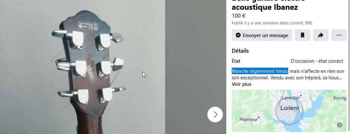 1520€ la Tele de "luthier". Alors évidemment on a pas le nom du luthier. Le pickguard laisse apparaître un jour près du micro manche on dirait, les ferrules à l'arrière ont pas l'air très alignées non plus, aucune specs importante n'est indiquée, bref...