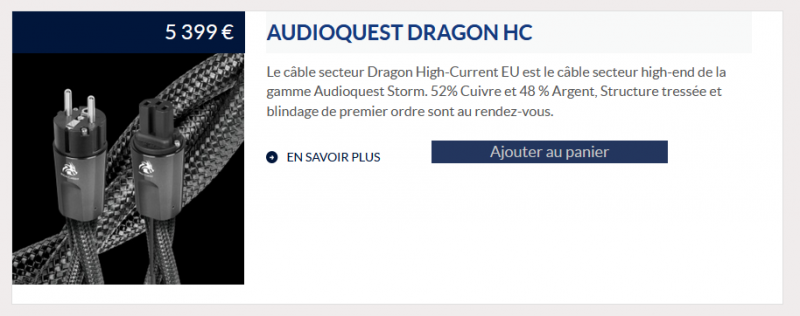 Après quand tu achètes un chaîne hifi à 100 000€ tu ne vas pas prendre un câble d'alim à 5€. C'est pas raccord. Les électrons ne vont jamais s'en remettre quand ils vont passer du bidonville au palais de Versailles.
