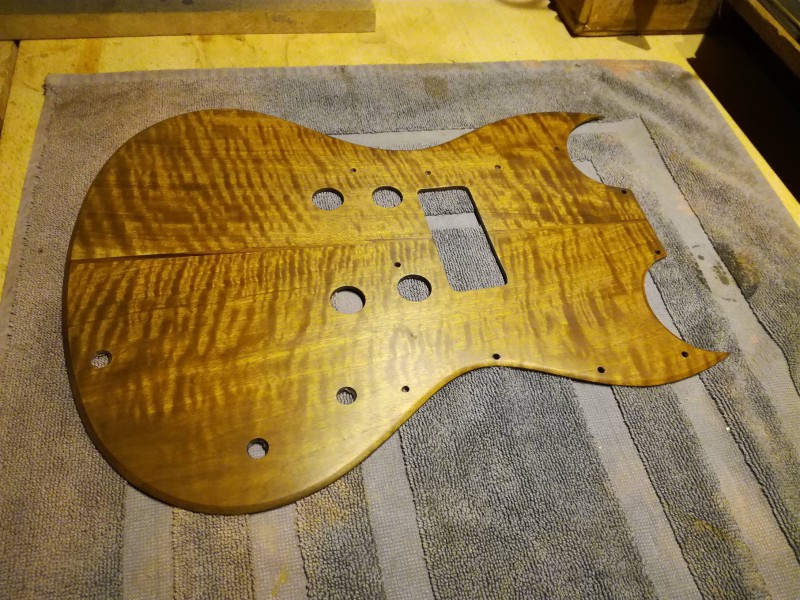Au départ, l'idée était de faire 2 plaques, une pour le pick et une autre pour cacher les trous des potards, ensuite on s'est orienté vers un pickguard unique.