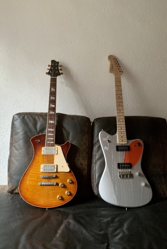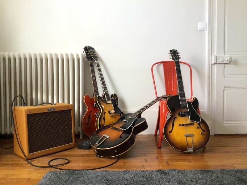 Electric' : FENDER Telecaster CIJ Reissue 62 "Olympic White", FENDER Stratocaster Player Series "Butter Cream", GRETSCH G2622T, GIBSON Les Paul Tribute 2019 "Honeyburst", GUILD S-200 P90, HB Esquire DIY, HB JA 60 « Shell pink »