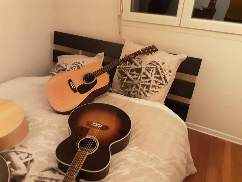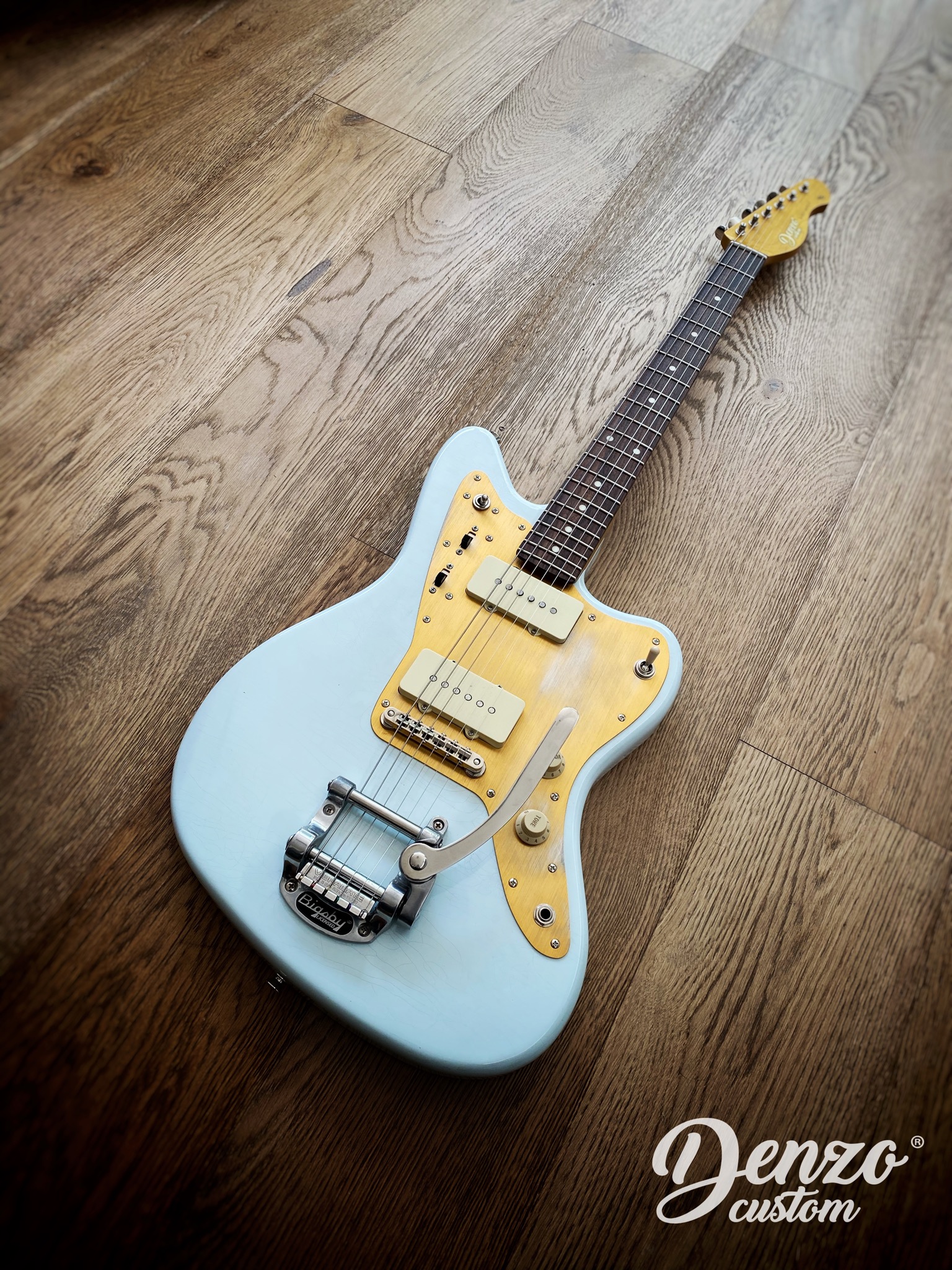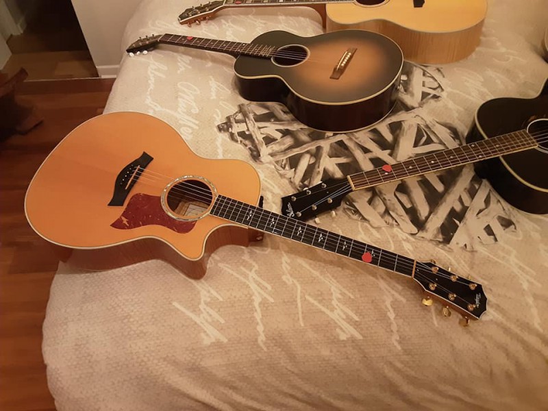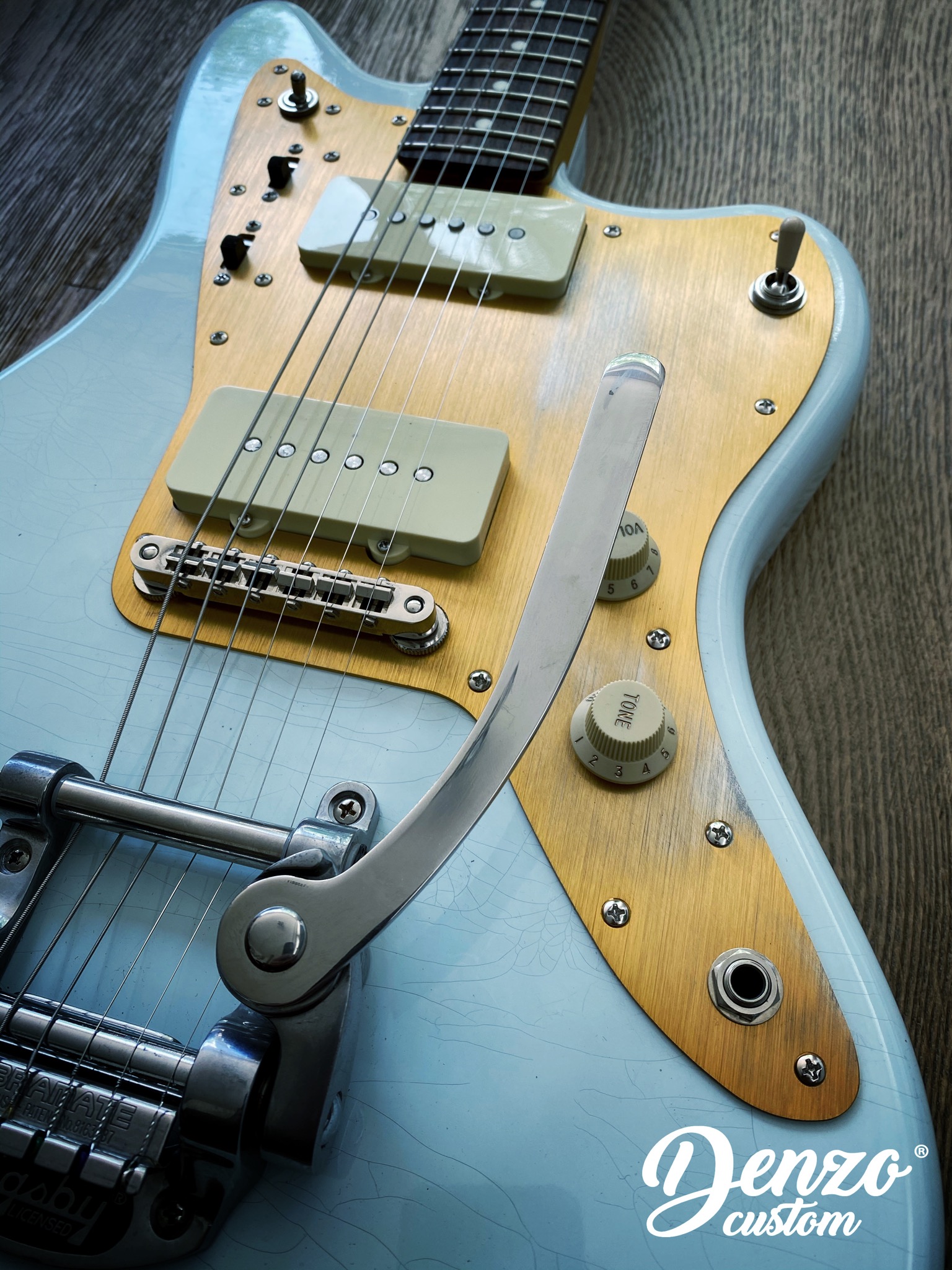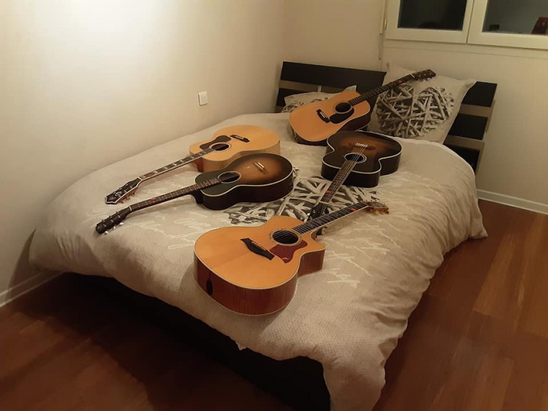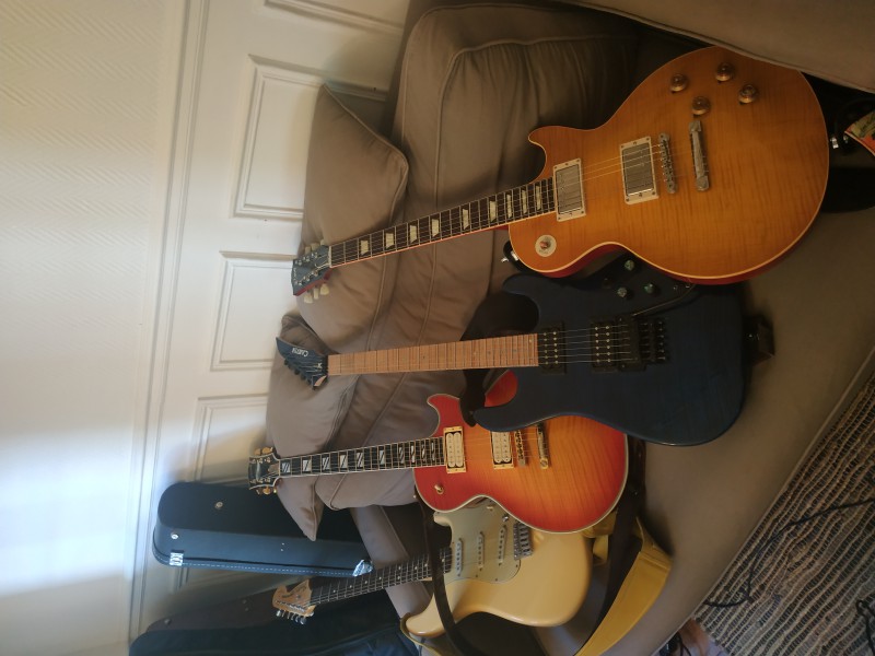A la base il devait repeindre le corps de ma blacktop sunburst customisée. Puis j'ai voulu essayer un corps chambered (problème de dos)... et vu qu'il m'avait offert un travail conséquent sur autre pelle pour s'excuser d'un retard (j'étais un peu gêné), je voulais le remercier en lui prenant un nouveau manche sur celle ci... Donc au final il reste plus rien de la base en bois
