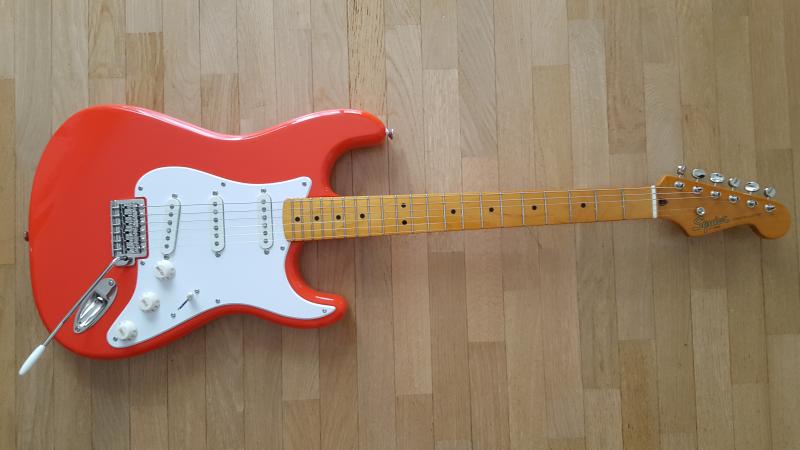 Elle est très belle cette Fiesta Red, et représente les meilleures strats des années sixties (Hank Marvin et les Shadows, puis Mark Knopfler pour les années seventies) On croirait voir une Custom Shop, copie de ces guitares qui ont été la rampe de lancement des strats Fender!