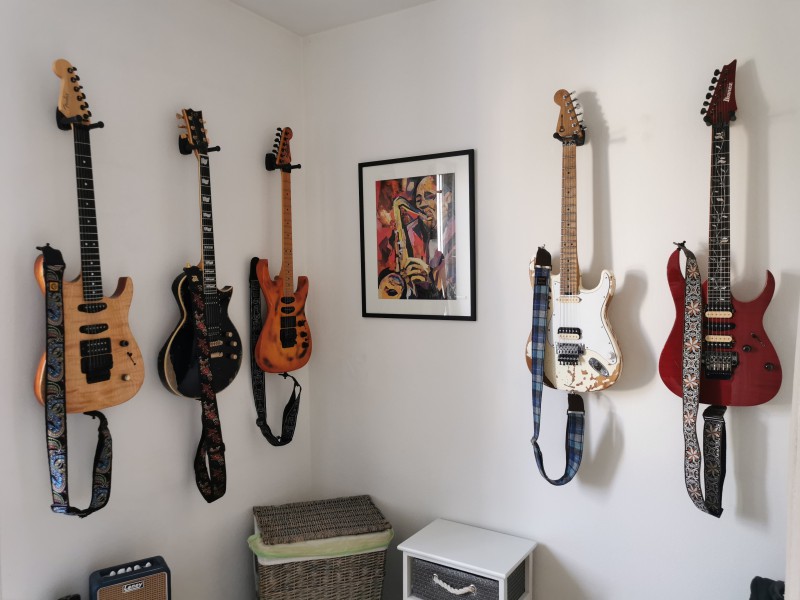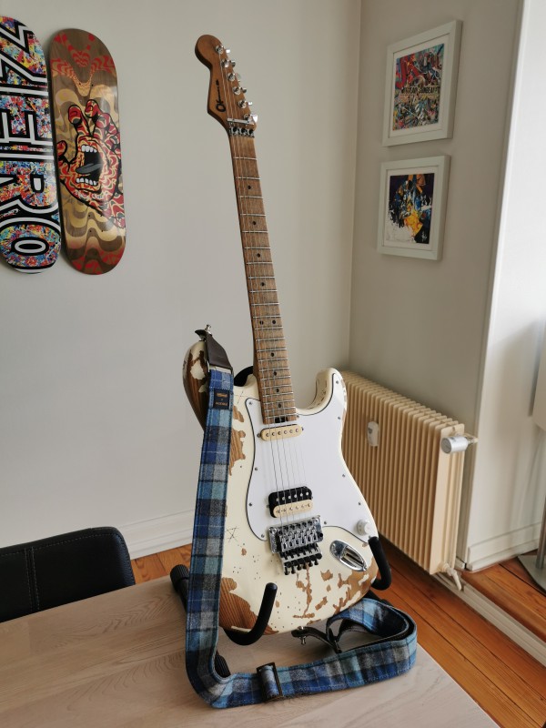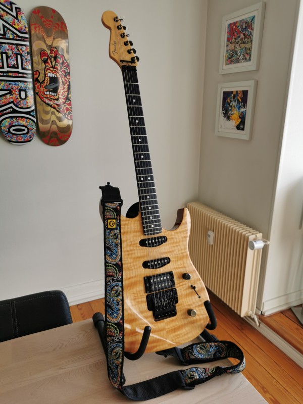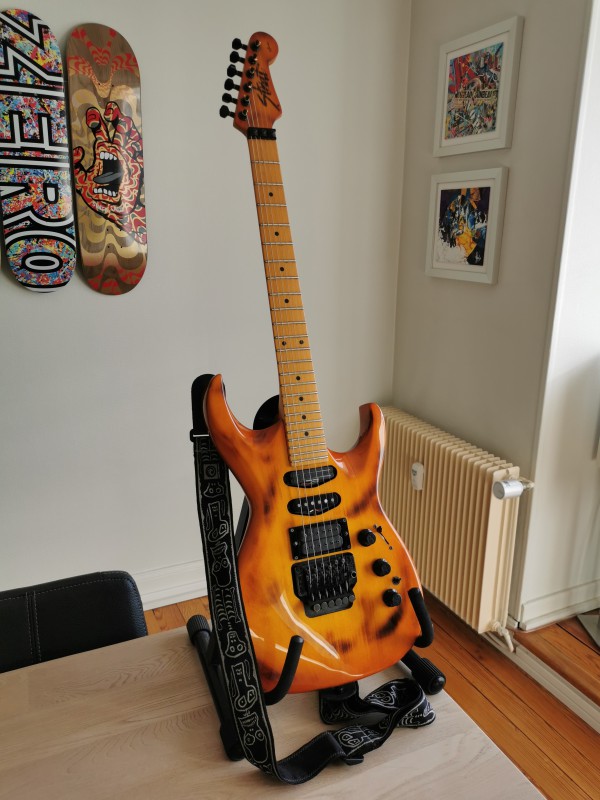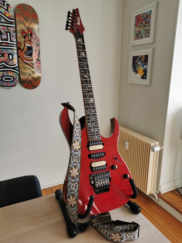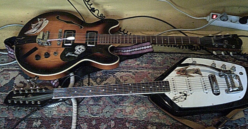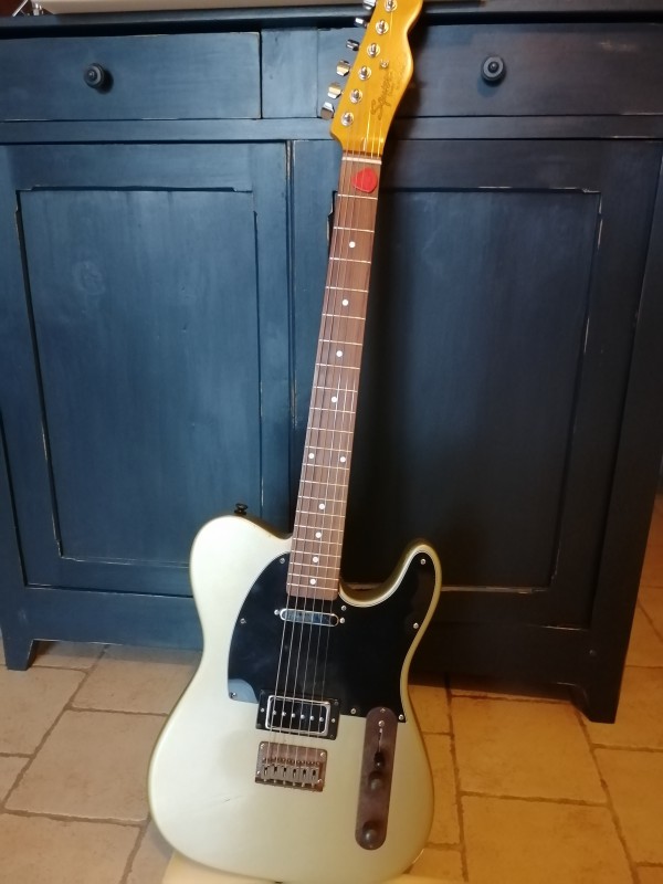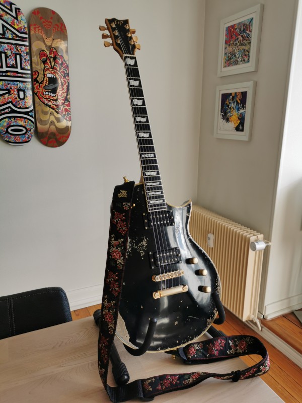 il m'a réalisé celle-ci sur une base de vox phantom, corps et manche réalisés par lofi guitars, micro P90 réalisé par ses soins et un Di marzio FS-1 en neck que j'avais. Elle sonne et se joue super bien cette phantom