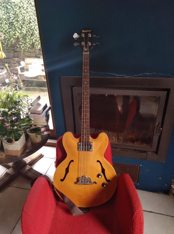 J'ai longtemps rêvé de la trouver dans son beau sunburst assez clair (comme celui des Casino, celui qui va jusqu'au cutaway), mais cette finition naturelle vieillie est très belle aussi. C'est vraiment jaune/orange, pas facile à prendre en photo.