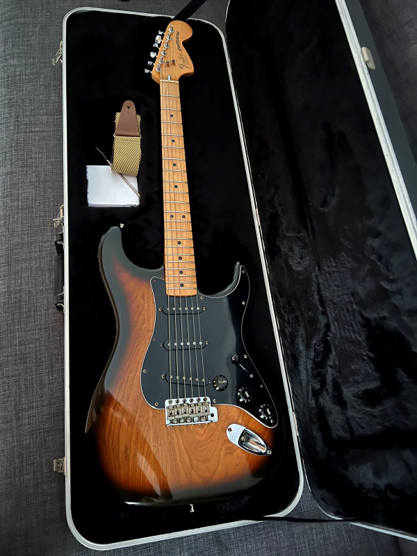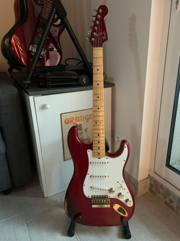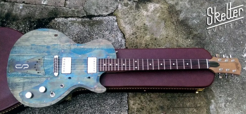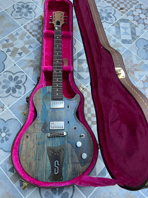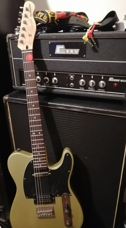 Une photo de mon « Esquire » daphné blue que j’ai réalisée à partir d’un kit HB T style. Pas mal de boulot (je n’avais jamais réalisé cela), des tentatives de reliquage à ma façon, un upgrade micro et pontets, 2 bombes de peinture nitrocellulosique, PG esquire,….