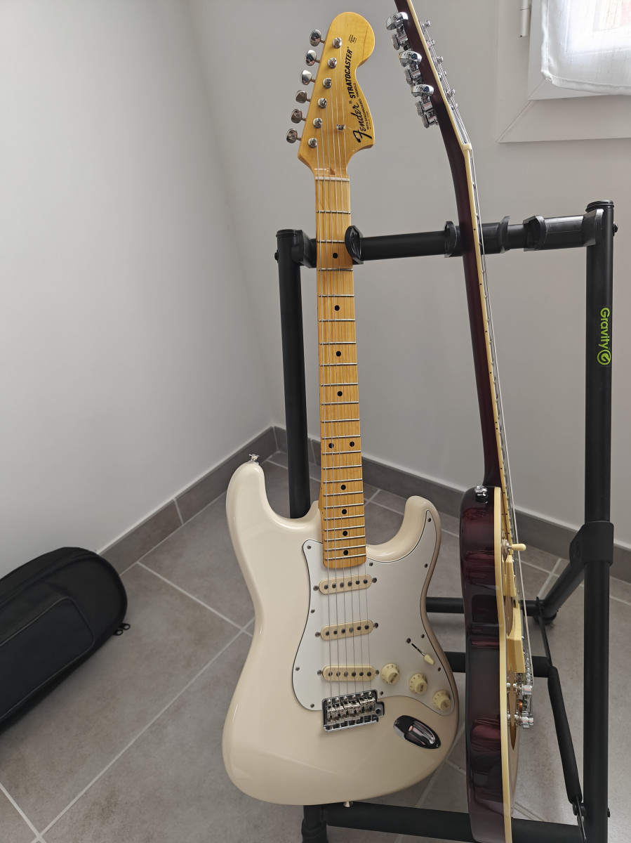 En attendant, ta strat me plait beaucoup et je la laisserai comme ça. Un olympic white manche érable et pickguard blanc, c'est class !