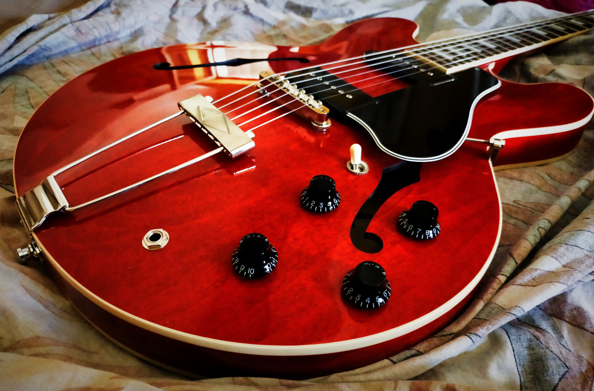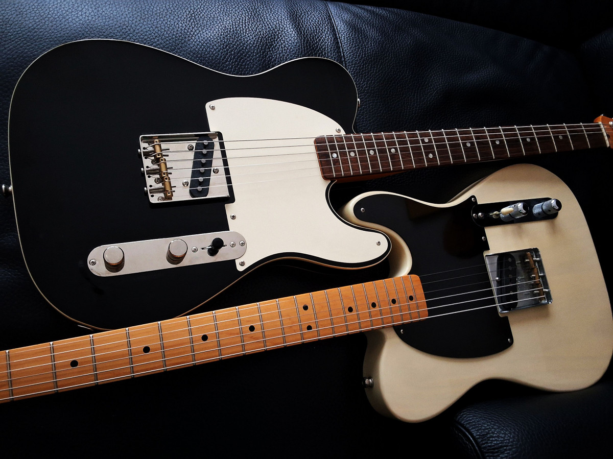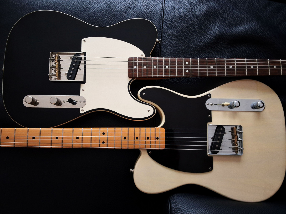 La blanche typée '50s est à l'origine une Fender Mexico - que j'ai depuis bientôt 20 ans, comme le temps passe! - qui a subi de lourdes modifications - comme elle sonnait superbement à vide et que le manche est génial, ça valait vraiment le coup! Elle a donc eu droit à un micro Fender Custom Shop Broadcaster, une électronique entièrement changée pour du top niveau, avec à la place de la position "faux manche" une position "cocked wah" beaucoup plus utilisable! Les pontets ont été changés pour des laitons intonés, et le pickguard par un noir en bakélite.