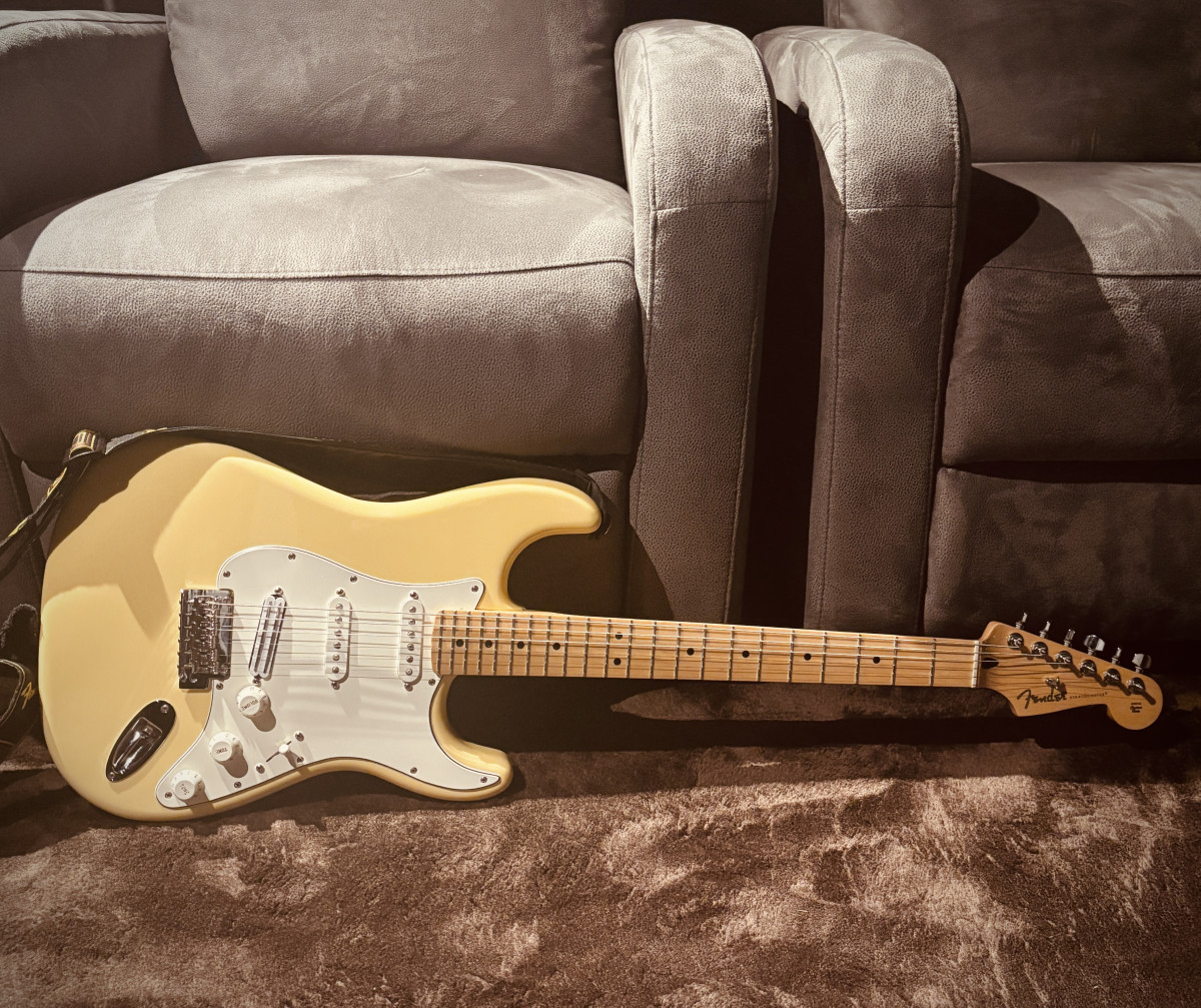 Photo de ma Stratocaster (avec un micro double format simple en bridge changé récemment). J’ai remis le Pickguard d’origine blanc, finalement ça lui va bien. Rien ne vaut l’original !