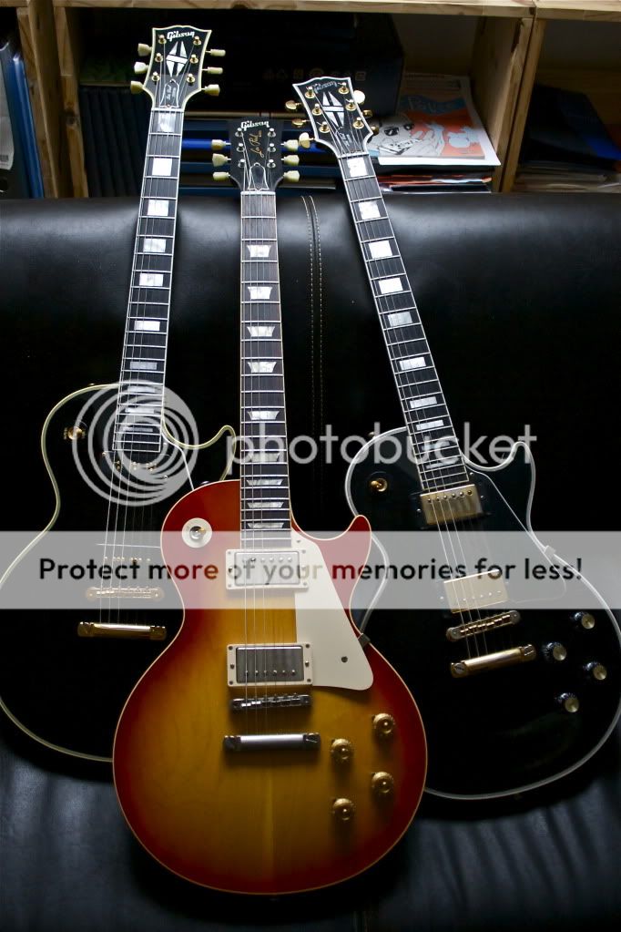 de g à d : Heritage H555 (es 355 like), Gibson J45 standard 2009, Heritage H575 (es 375 like) modifiée micros hep cat, Firebird custom (assemblage, vernie par Quérey, micros Hep Cat et Seymour Duncan -sic), Martin and Co 12 cordes (1977), Martin MTV-1 unplugged custom (1996). Amplis divers dont un Tweedie Pie Bruno.