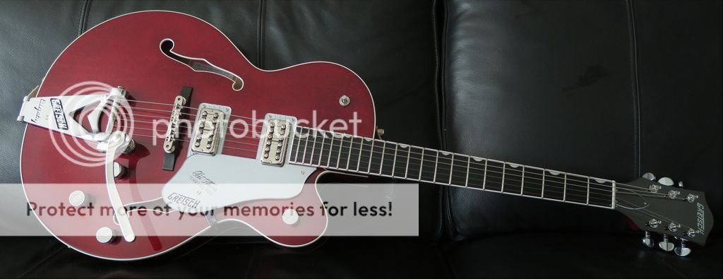 Ma seule guitare signature est aussi une Gretsch: une G6119 Chet Atkins Tennessee Rose. Je ne l'ai pas achetée pour Chet Atkins (que je n'ai jamais vraiment écouté), mais pour ses specs: 16", full hollow, corps relativement fin, diapason long type Tele ou L5, Filtertrons, etc...
