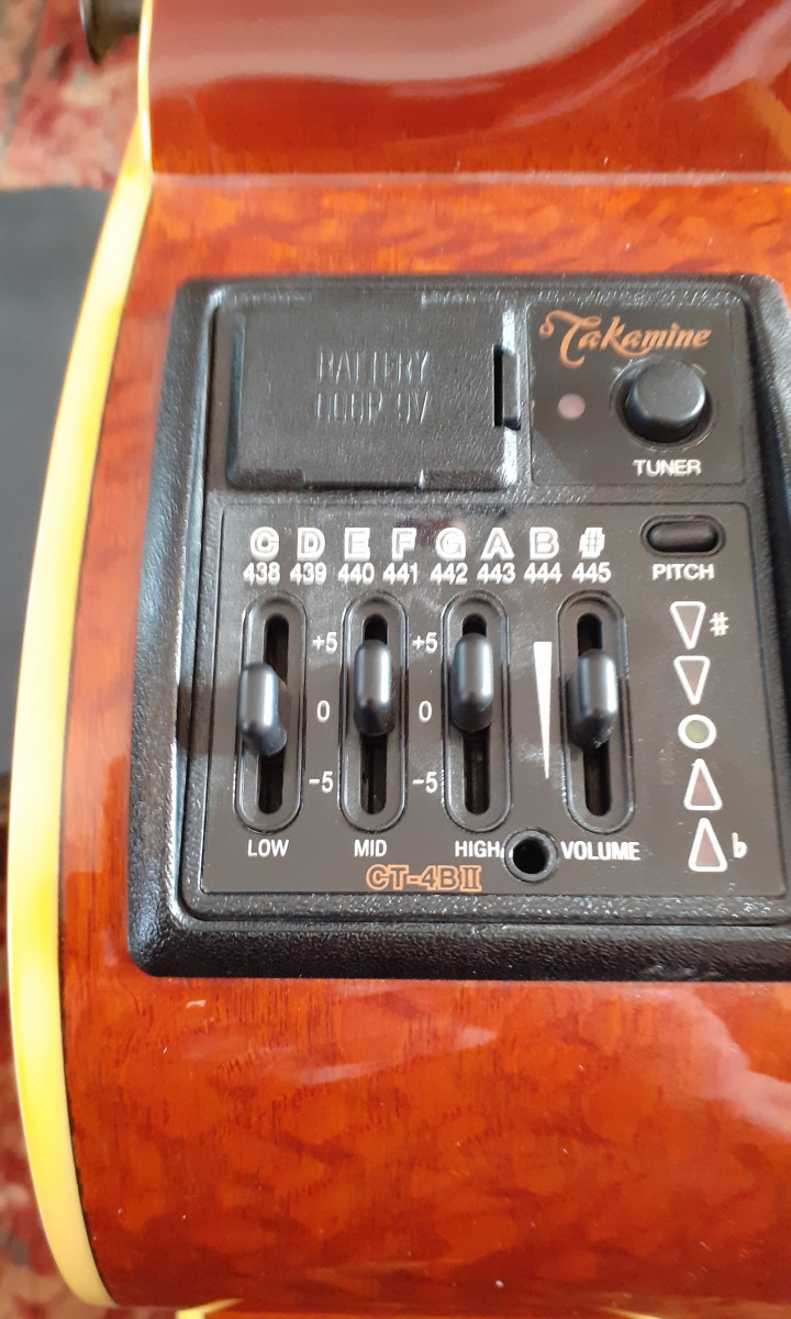 Changement du Pre-amp cassé par un Takamine plus récent et adaptable sans modif.