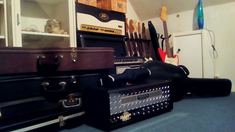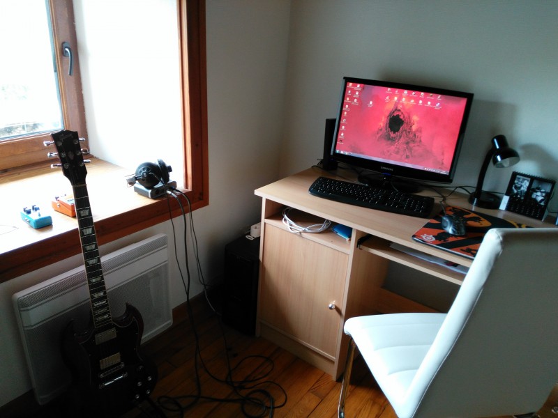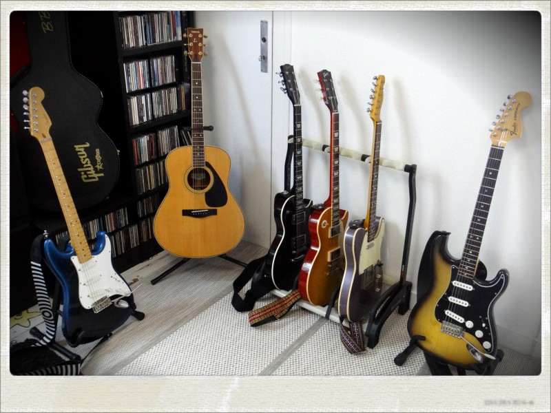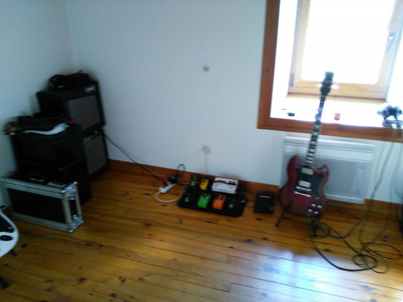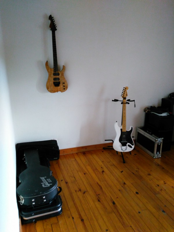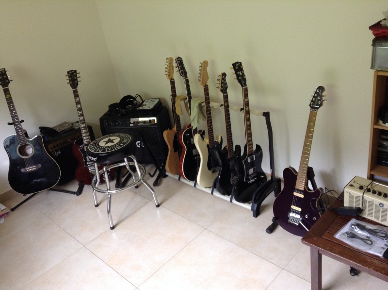 Quant aux guitares... On en a jamais assez. Et là , il n'y a sur la photo que celles que je joue le plus. Sinon faut en rajouter 6 supplémentaires, qui sont soigneusement rangées dans leur case en attendant de ré-immigrer dans mon 30m2 de banlieue lyonnaise.