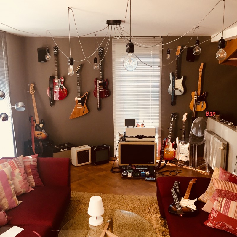 La télé fait face sur l'autre mur (sans intérêt, mais ça explique les HPs surround sur le mur du fond