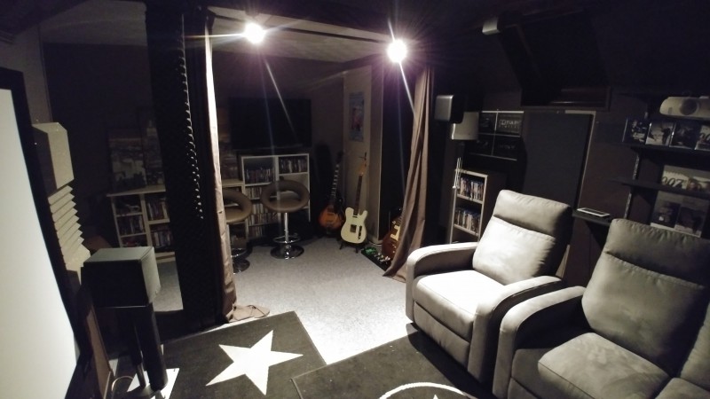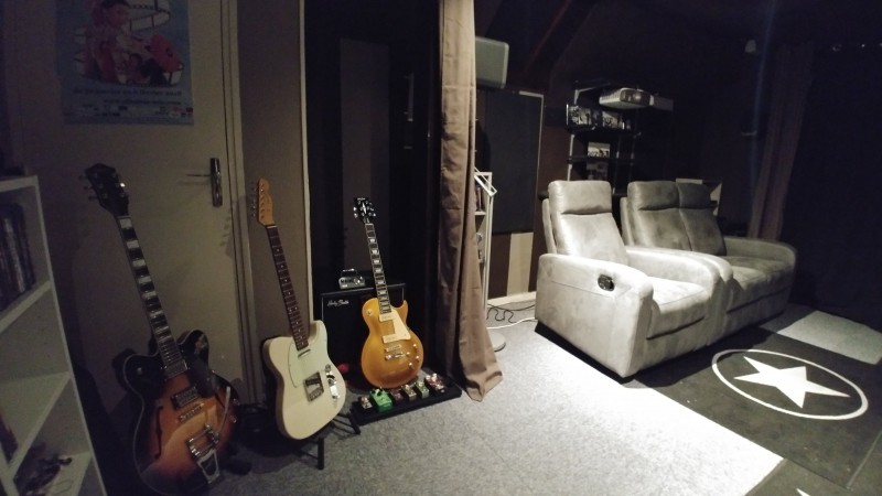 Passionné aussi de Home Cinéma, je possède une "petite" salle dédiée, mon "antre", dans les combles de ma maison. J'ai profité de cet espace quelque peu traité acoustiquement pour y installer mon matos électrique et y réserver un coin spécifique. Espace un peu original s'il en est mais bien adapté à la pratique de la musique... .