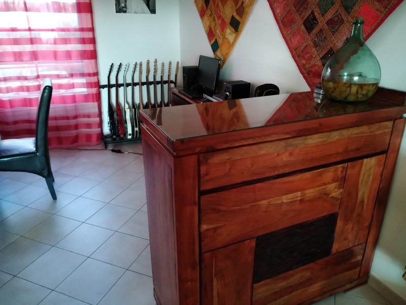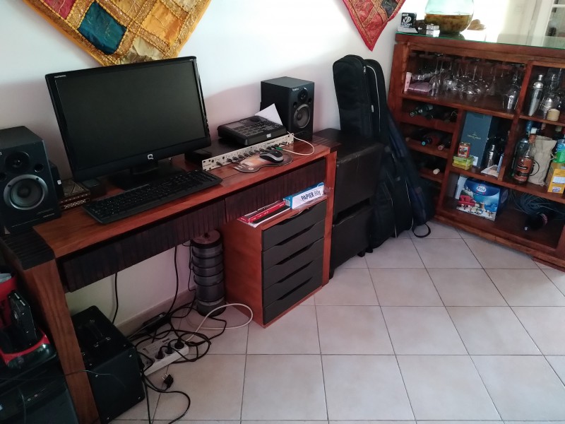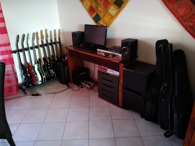 J'ai quelques grattes qui ne sont pas sur les photos, le PC est un PC de son ... dans les tiroirs, mes pédales, multis, jacks , accordeurs etc ... Sous le bureau un petit Blackstar 1w pour faire mumuse
