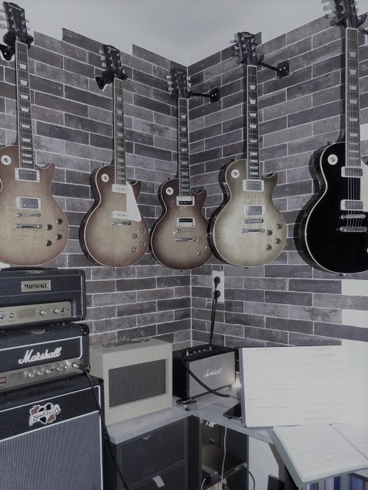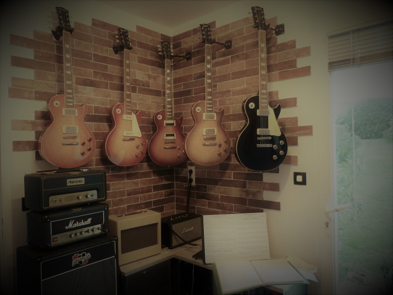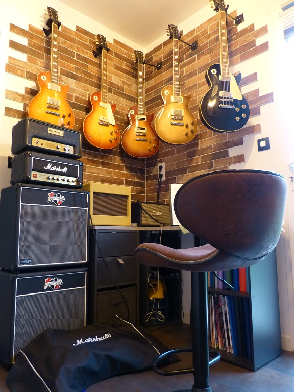 lumière feutrée, parquet, boiserie sur bas de mur, papier peint "art deco", canapé velour, et surtout une bibliothèque pour ranger les guitares que je ferai sur mesure, tout comme le bar.