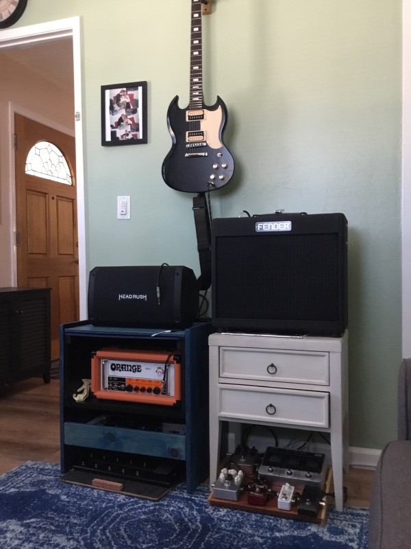 Je cherche un meuble dans le style, un sous lequel je pourrai glisser ma housse de pedalboard, puis au dessus des casiers ouverts pour mon baffle, puis au dessus , plusieurs casiers sur lesquels je peux placer mes têtes d ampli, les unes au dessus des autres.