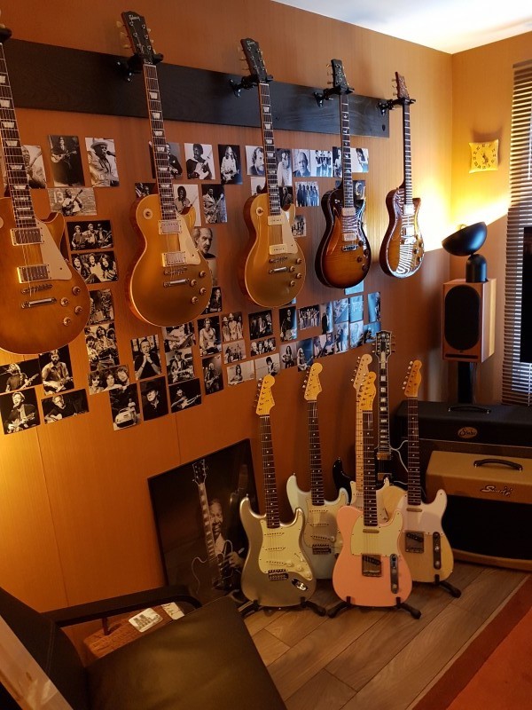 Ma Strat Vanzant, une partcaster, une électroacoustique Takamini, un ukulélé