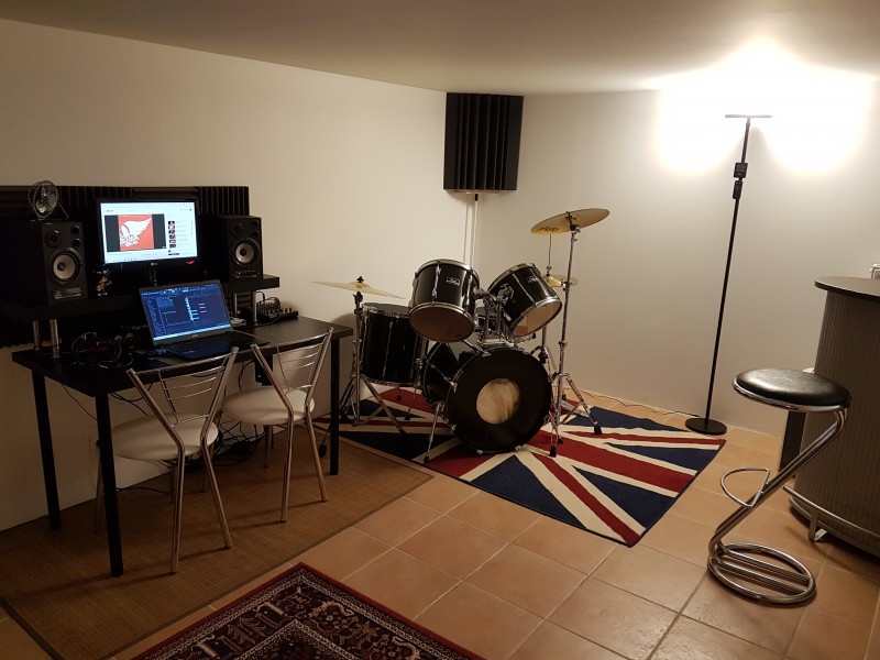 Maintenant, j'ai une pièce avec tout mon bazar dedans et dans laquelle mon fils peut enfin jouer de la vrai batterie (il supportait plus de jouer sur sa batterie électronique). Je mets tout en forme et vais essayer d'améliorer chaque spot au fur et à mesure et en faisant des compromis (les lois de l'acoustique ne sont pas compatibles avec l'optimisation de mon espace de toute façon).