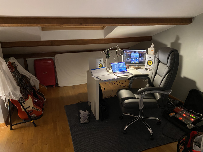J'ai terminé l'aménagement de mon coin: le rack à guitares à gauches, le bureau au milieu et les effets à droite. Je me suis posé dans les combles aménagés de la maison, à l'opposé des chambres : ça me permet de jouer à volume raisonnable 24/24 sans embêter personne. J'ai aussi fait poser une clim réversible, j'ai 20° toute l'année.