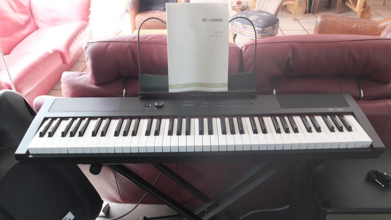 En parfait état, sous garantie, complet avec pédale de sustain, alimentation, pupitre, et doc.