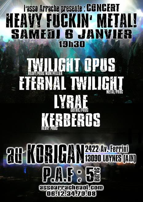 dopamine dream Special Top utilisateur #1 Publié par dopamine dream le 28 Déc 2006, 11:16 Mon groupe, Eternal Twilight, jouera accompagné de Kerberos, Twilight Opus et Lyrae le 6 Janvier au Korigan, PAF=5 euros ! Venez faire péter le Korigan ! A plouch' http://www.myspace.com/eternal(...)rance