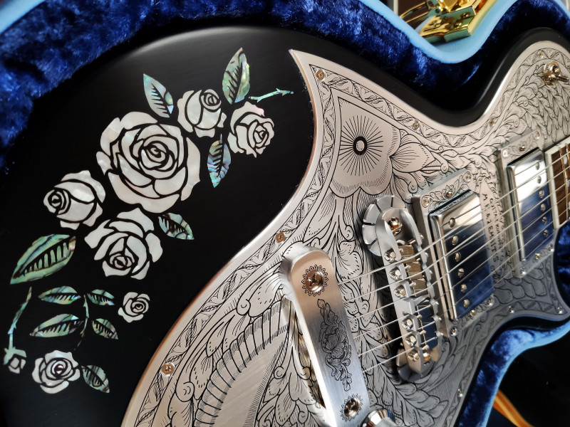 La Flappy Pigeon n°29 (sur les 50 premières produites - on sait qu'une "rallonge" de 20 à 30 instruments a été ensuite produite). J'ai dû la faire venir des USA (de chez Trogly, le youtubeur bien connu des guitaristes). Je n'en ai pas parlé parce que j'avais bien conscience du côté démesuré de cet achat ... que je n'ai jamais regretté depuis!