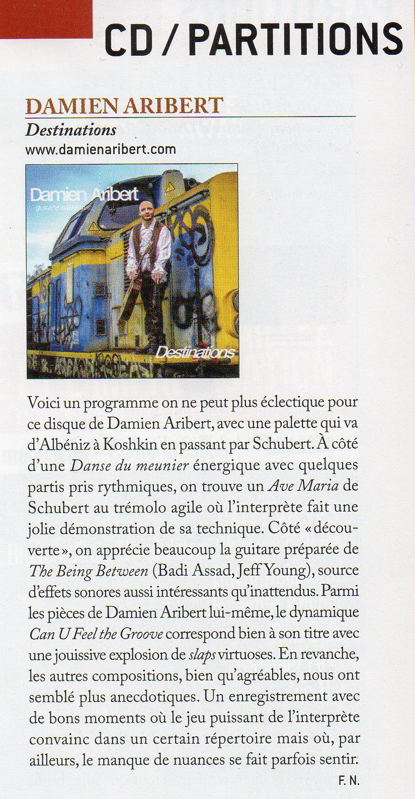 Je m'appelle Damien Aribert, je suis professeur de guitare classique au Conservatoire d'Avranches-Mont Saint Michel. J'ai sorti en juin 2014 mon premier disque "Destinations", enregistré au Studio La Buissonne à Pernes les Fontaines dans le Vaucluse. Ce disque aux sonorités éclectiques est disponible à la vente sur mon site