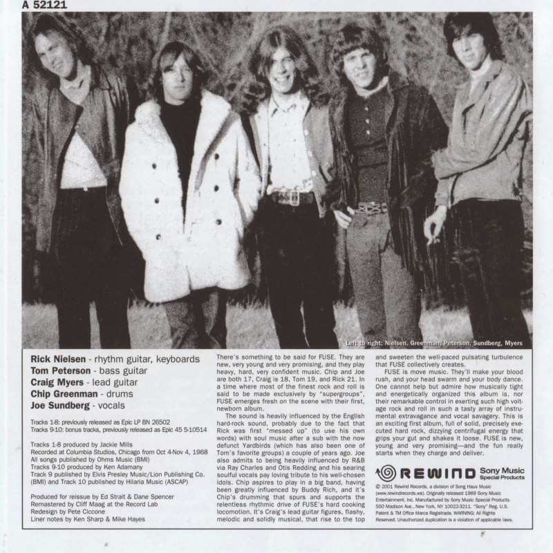 ). Dans FUSE, Rick Nielsen, en plus d'être compositeur principal, cumulait les postes de guitariste et claviériste (un autre guitariste officiant comme soliste). Pour l'époque, l'album est franchement excellent et évoque sans difficulté ce que faisait notamment Deep Purple (période Book Of Taliesyn, donc exactement au même moment!).
