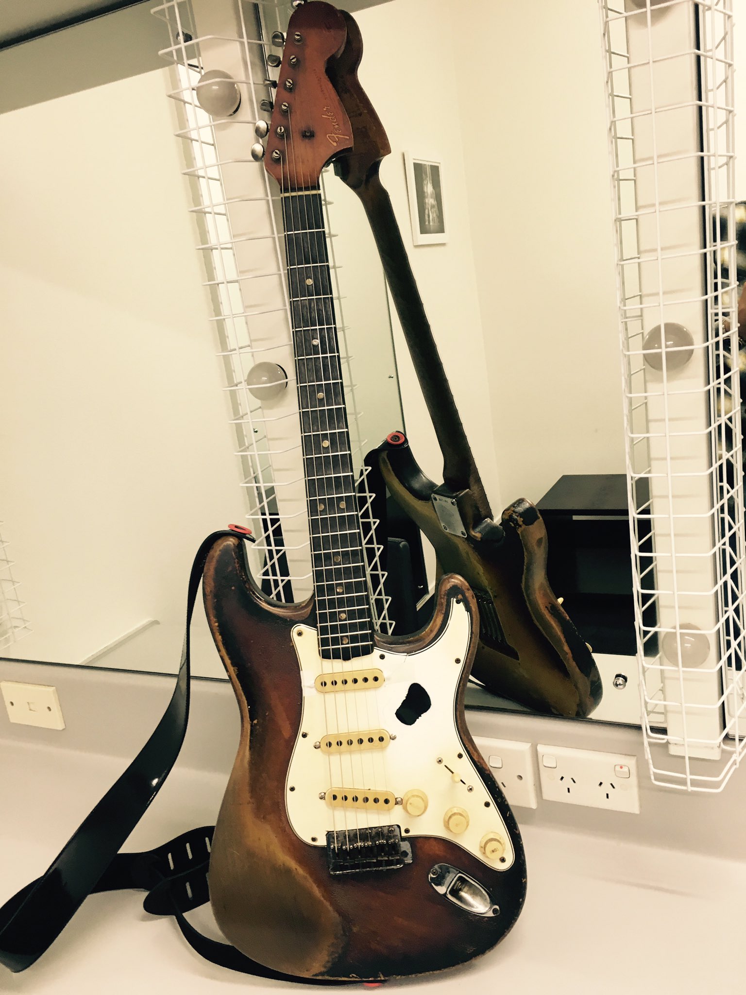 Pour les fender, voilà les photos que j'ai trouvé sur son Tweeter et sur Youtube.
