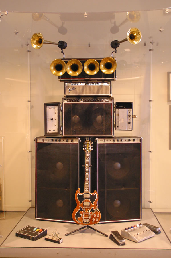 To create his distinctive guitar sound, Cipollina developed this one-of-a-kind amplifier stack. All of his guitars, including the one here, were wired with two pickups, one for bass and one for treble. The bass pickup fed into the two Standel bass amps on the bottom of the stack. Each Standel was equipped with two 15-inch speakers. The treble pickups fed the two Fender amps-a Fender Twin Reverb with two 12-inch speakers and a Fender Dual Showman- that drove the six Wurlitzer horns.