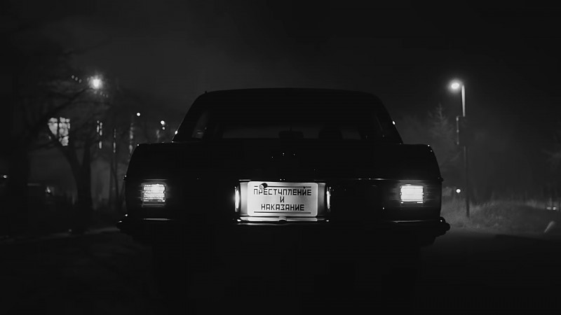 . Le fait de l'écrire en russe fait évidemment référence à Dostoevsky, et c'est aussi bien sûr une référence à la chanson de Sheena du même titre (dans le clip de laquelle une Mercedes identique était semblablement tranchée).
